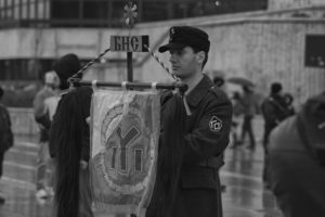 Eine Gruppe von PolizistInnen eskortiert die FaschistInnen – unter ihnen Hooligans des Fußballvereins von »CSKA Sofia« – über den Platz zum Startpunkt der Veranstaltung. Diese beginnt in etwa einer Stunde, die Gruppe zerstreut sich. Unbehelligt bewegen sich Kleingruppen über den Platz. Die Veranstaltung dient dem Gedenken an Hristo Lukov.